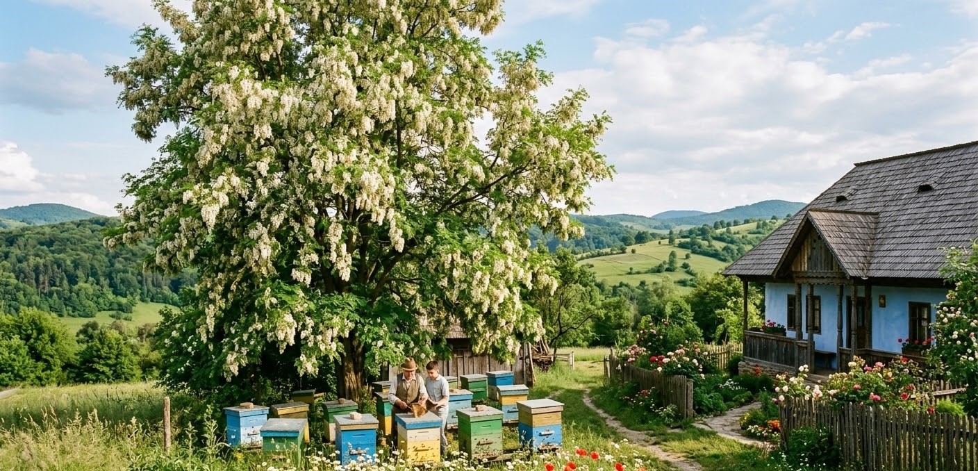 black locust blooming tree beehives traditional romanian house salcamul