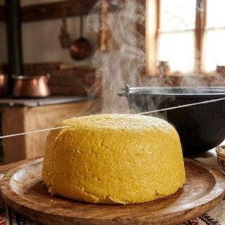 traditional romanian mamaliga cutting with thread polenta